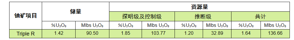 Triple R鈾礦礦體展布示意圖 Fission公司于2018年6月完成當年冬季勘探工作。本次冬季勘探工鉆井36口,完成6947米鉆探工作量,本次勘探成果包括: (A) 使R780地段部分推斷級資源量轉(zhuǎn)化為控制級資源量,為項目預可研報告做準備; (B) 擴大1515W地段的礦體規(guī)模; (C) 采集礦區(qū)的工程地質(zhì)條件樣品。 目前Fission公司已經(jīng)開展夏季勘探工作,總計費用預計640萬加元,總計147口鉆井(3425m)的鉆探工作量,進一步升級重點礦化區(qū)R780E的資源量級別,聚焦爭取年底前完成預可研報告。 Fission 公司旗下項目資源量
