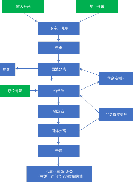 世界主要鈾礦的開采方式包括三種:原位地浸開采,露天開采及地下開采。世界約48%的天然鈾通過原位地浸開采生產(chǎn)出來,46%來自于常規(guī)開采方法(露天開采及地下開采)生產(chǎn)出來,6%作為其他礦產(chǎn)品副產(chǎn)品采出。 鈾礦開采生產(chǎn)工藝示意圖 2017年世界各國(guó)產(chǎn)鈾比例(總產(chǎn)量為59,531噸鈾) 原位地浸開采 原地浸出采鈾是將溶浸液通過注液鉆孔注入到可滲透的含礦含水層,使溶浸液在滲透過程中與鈾接觸并進(jìn)行溶解反應(yīng),生成含鈾溶液,并從抽液孔被抽至地表,輸送到車間加工處理后獲得鈾產(chǎn)品的流程。 ? 適用賦存于含水及可滲透砂巖中鈾礦物開采。 ? 圈定鈾礦的邊界品位為0.001%。 ? 根據(jù)浸出機(jī)理的不同,分為酸法和堿法開采。 開采的適用條件: (1)含礦巖性應(yīng)為具有滲透性的砂巖、砂礫巖。礦體賦存于地下水位以下的含礦含水層中。充水性和滲透性是地浸是否可行的決定性因素。 (2)礦體產(chǎn)狀平緩(傾角一般小于10度),礦體頂?shù)装鍛?yīng)是良好封閉的不透水層。 (3)礦床平米鈾量應(yīng)在最低經(jīng)濟(jì)指標(biāo)之上,含礦含水層中碳酸鹽含量>2%則不宜用酸法浸出。圍巖以長(zhǎng)石石英質(zhì)或石英質(zhì)砂巖最宜。 (4)按照目前鈾價(jià),開采礦體最大埋藏深度不宜超過400-600m。 浸出機(jī)理 酸法 主要使用硫酸作為溶浸劑,礦石中鈾隨溶浸液pH值的下降2以下后從沉淀態(tài)變?yōu)槿芙鈶B(tài),生成硫酸鈾酰溶液。含礦含水層中碳酸鹽含>2%則不適用。 堿法 主要使用碳酸氫銨作為溶浸劑,礦石中鈾隨溶浸液pH值上升到9以上后礦石中的6價(jià)鈾與碳酸鹽中的碳酸根(CO32-)絡(luò)合,生成碳酸鈾酰溶液。產(chǎn)品液鈾含量低,銨鹽也造成地下水污染。 二氧化碳+氧氣 原理是氧氣氧化礦石,在地下水中加入二氧化碳后,形成的碳酸氫根(HCO3-)離子與礦層中的鈾發(fā)生反應(yīng),使鈾溶解在溶液中,也屬于堿法浸出分類。 細(xì)菌浸出 主要選用氧化鐵硫桿菌,在浸出鈾的過程中,主要起間接催化作用,能促進(jìn)黃鐵礦和硫酸亞鐵的氧化,促進(jìn)6價(jià)鈾生成??山档退岷?。需配合酸法使用,但并非一種獨(dú)立的浸出方法。 地浸的主要優(yōu)點(diǎn): (1)開采方法安全簡(jiǎn)單、工藝流程短。采礦階段無(wú)需搬運(yùn)、破碎礦石,水冶階段無(wú)需磨礦和固液分離,縮短了采冶工藝流程,直接生產(chǎn)成本低。 (2)礦山建設(shè)周期短、基建投資少,勞動(dòng)強(qiáng)度低、自動(dòng)化程度高,固定資產(chǎn)折舊低。 (3)環(huán)境污染小。一是抽注基本平衡,地浸溶液是在閉路管道內(nèi)循環(huán)使用,其廢水排放量顯著減少;二是放射性粉塵污染得到徹底改善;三是尾渣和廢氣的污染減到了最低程度。 露天開采即一個(gè)移走礦體上的覆蓋物,從敞露地表的采礦場(chǎng)采出鈾礦物的過程。主要適用于主礦體埋藏較淺的鈾礦床開采。 主要優(yōu)點(diǎn)包括: 1. 基建周期短。2-4年/大型 6-8月/小型。 2、開采空間大,勞動(dòng)生產(chǎn)率高。比地下開采高2-10倍。 3、礦石損失、貧化率較小。損失率3%-5%貧化率5%-8%。 4、開采成本低,勞動(dòng)條件好,生產(chǎn)安全?! ?/span> 主要缺點(diǎn): 1、開采受到氣候影響大?! ?/span> 2、基建設(shè)備投資大。 3、礦山占地多,對(duì)地表環(huán)境破壞大。 地下開采即通過開掘井巷工程從地下礦床的礦塊里采出礦石的過程,通過礦床開拓、礦塊的采準(zhǔn)、切割和回采4 個(gè)步驟實(shí)現(xiàn)。主要適用于埋藏較深及地表不允許露天開采的鈾礦床。以地壓管理方法為依據(jù),分為空?qǐng)霾傻V法充填采礦法、崩落采礦法三大類。